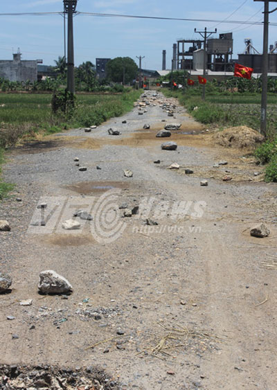 Theo VTC News – một cơ quan truyền thông của nhà cầm quyền CSVN, dân Châu Xá rào làng, xẻ đường, đắp mô để làm tê liệt hoạt động của các nhà máy đang vây quanh làng.